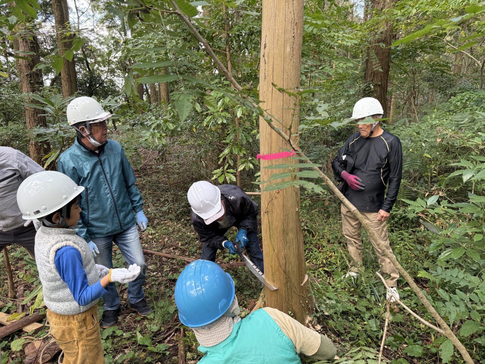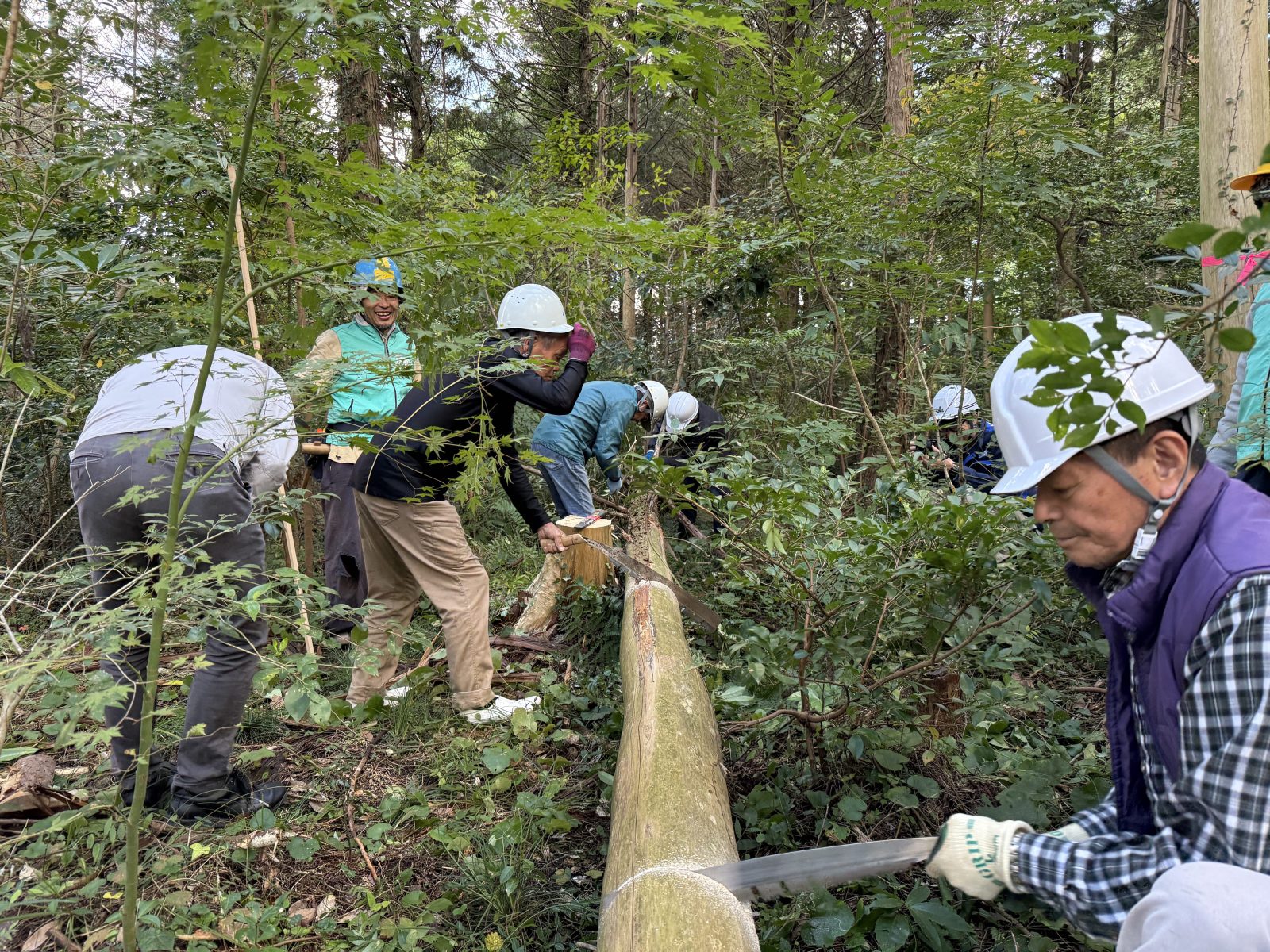 今日の伐採体験は、間伐の一種である「皮むき間伐」という立木の樹皮を向くことで木を立ち枯れさせ、樹皮向きの2年後の乾燥が進んだ樹木を間伐する方法を、いとなみさんご指導のもと、窓鋸とよばれるのこぎりを使って、実際に伐採・倒木させ、玉切りという分割作業までを参加者手分けの上、行いました。