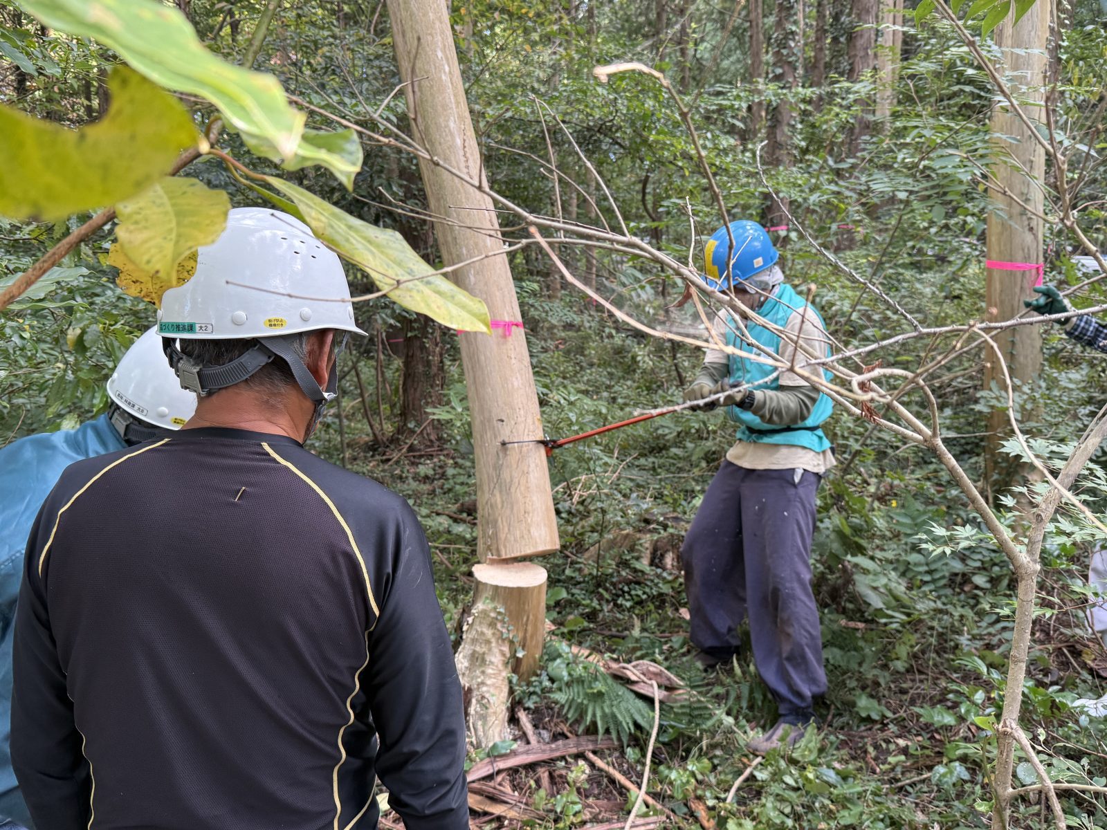 私達が参加した午後の部は、主に地域の方と設計事務所からなる参加者で、特に地元の方は大工さんなど、ほぼ玄人という構成。林業関係の方という訳ではありませんが、工具の扱いや段取りについては、主催者のいとなみさんも感心される要領の良さ。みるみるうちに作業はすすみ、伐られた木からは、ヒノキの心地よい香りがしていました。