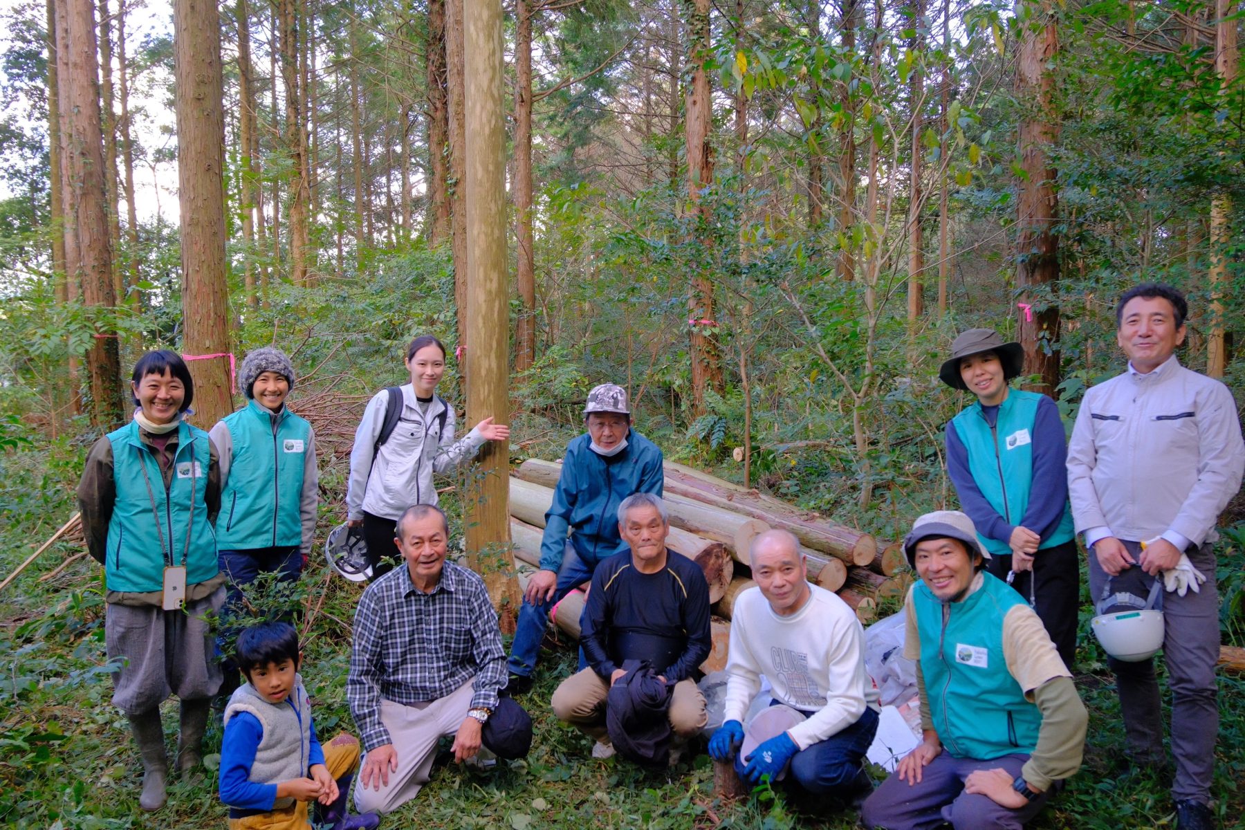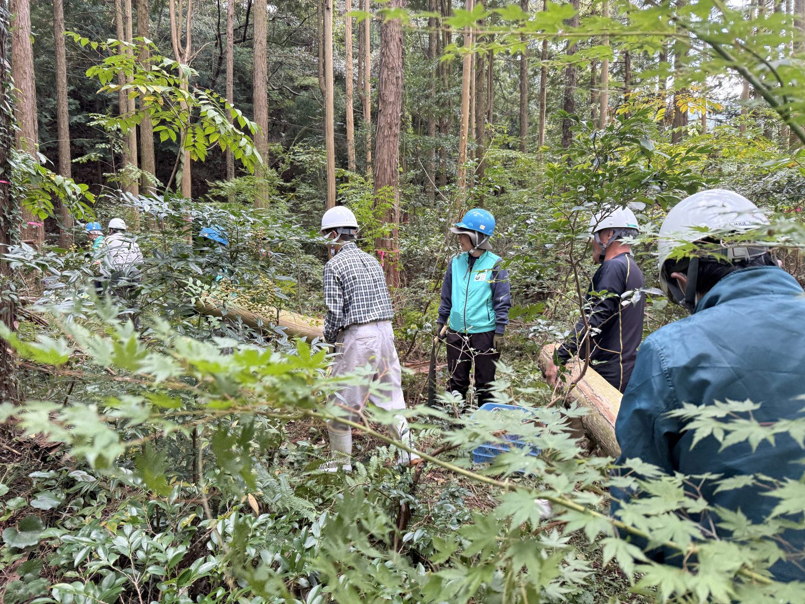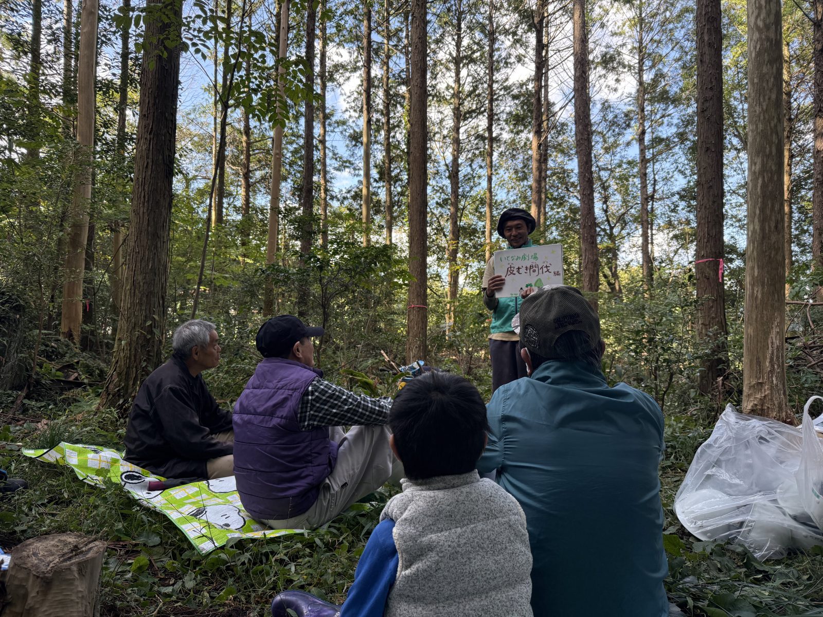 会の最初にはいとなみの藤井さんから紙芝居を使って、森の役割や間伐の効能のレクチャーを受けたあと、実際の伐採作業を手分けして実施しました。伐った木は80年生の直径20cm程のヒノキ。木を倒す方向の見立てから、木に切れ目を入れ徐々に切れ目を深くしていき、倒木。倒木後には一定寸法毎に木を分割し、以下所にまとめるという一連の作業を行いました。