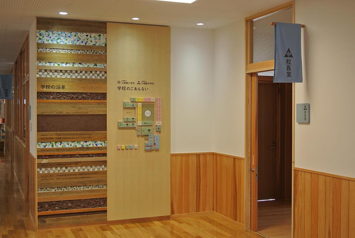 学校の歴史、配置図を兼ねた地元あわびや旧校舎の床材等を使用したサイン