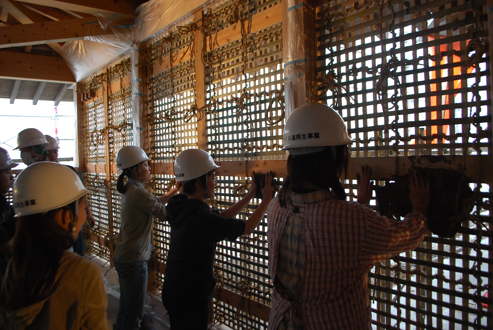 泥だらけになって土壁を塗ったため途中の写真がありませんが、今後もさくら湯の現場見学会の様子をお伝えしていきたいと思います。