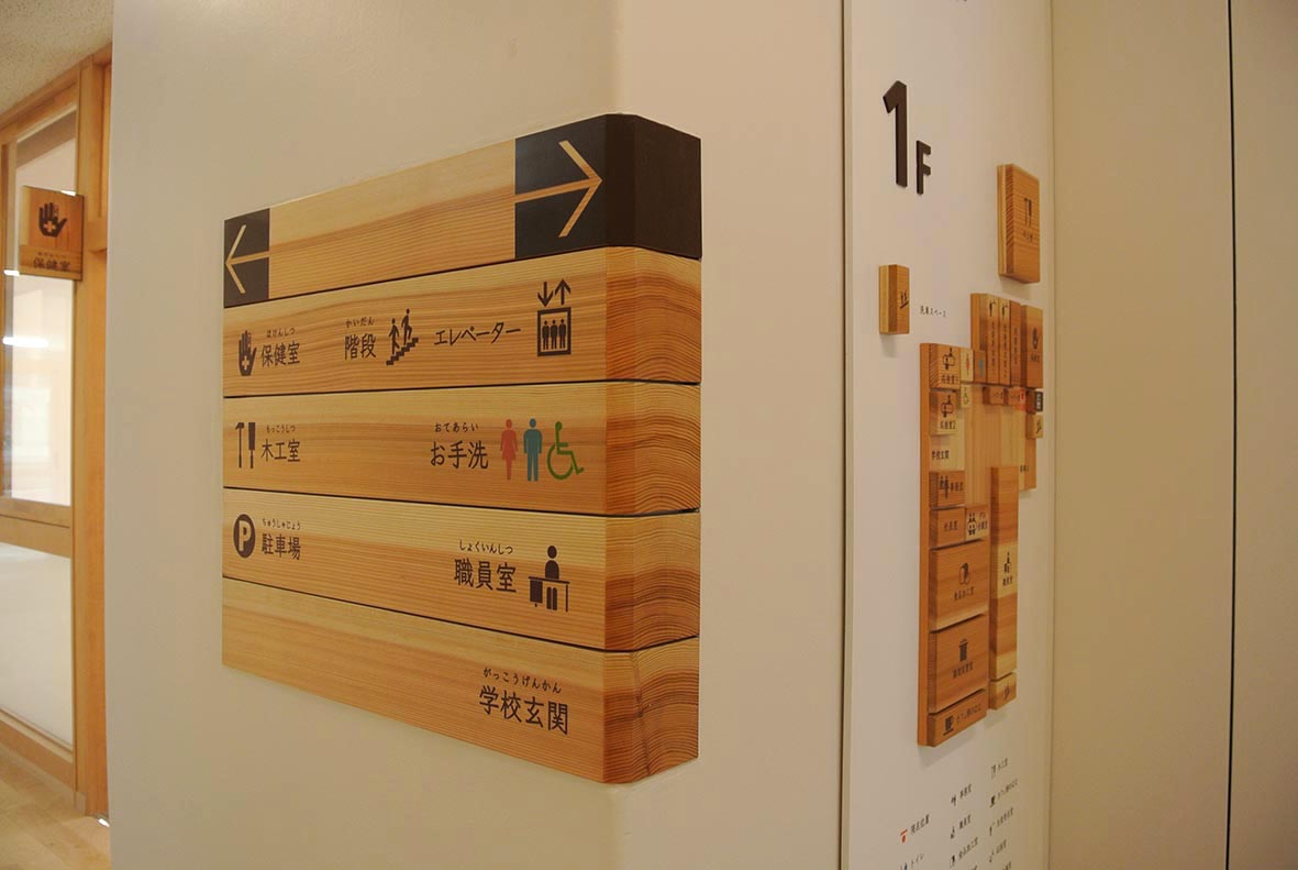 学校の歴史、配置図を兼ねた地元あわびや旧校舎の床材等を使用したサイン