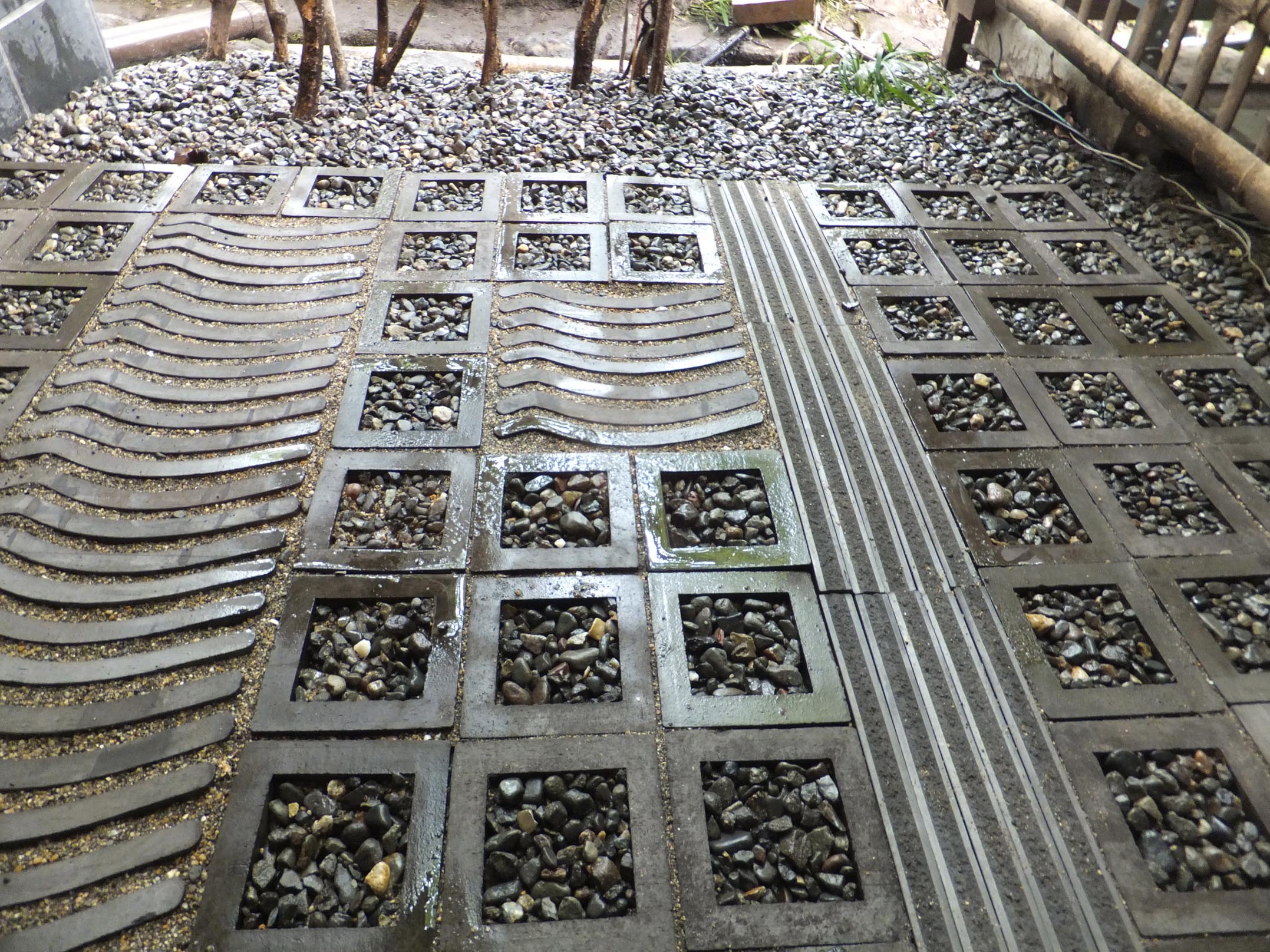 隙間に砂や玉砂利をつめて、お水をかけたら、完成です。